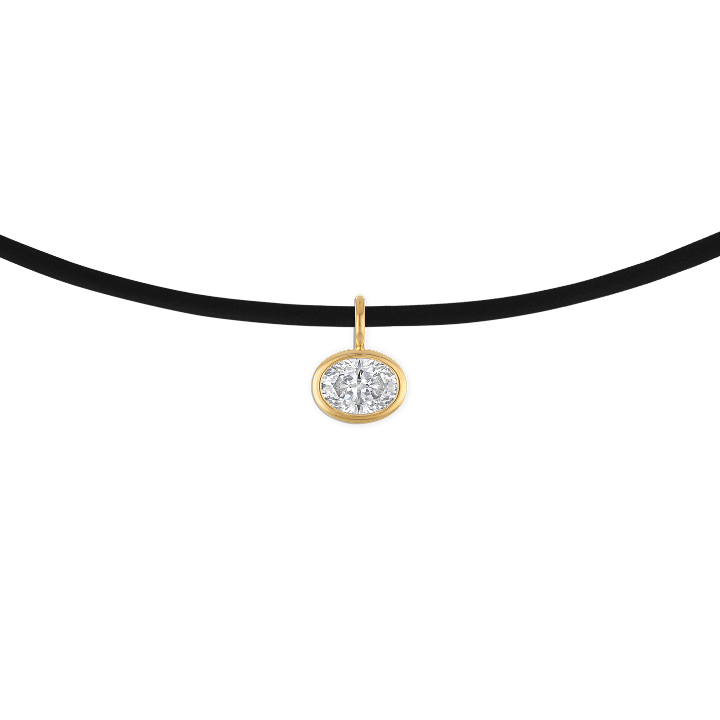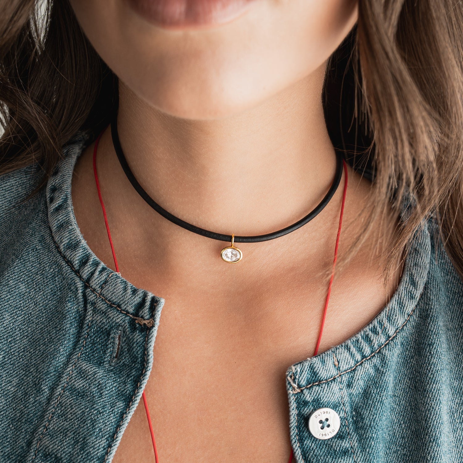 - 3mm black leather necklace with vermeil yellow gold bezel set lab gemstone E/W pendant, 8mm length
