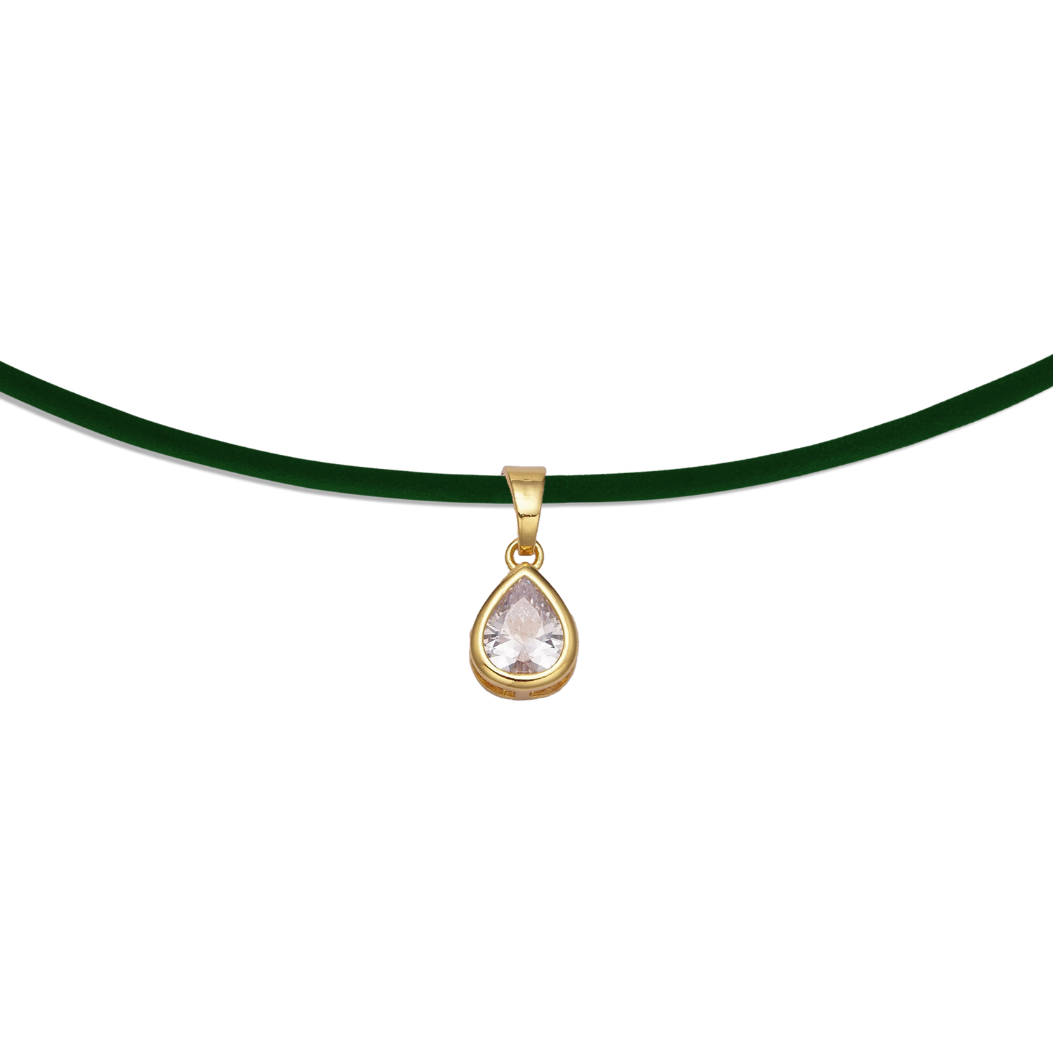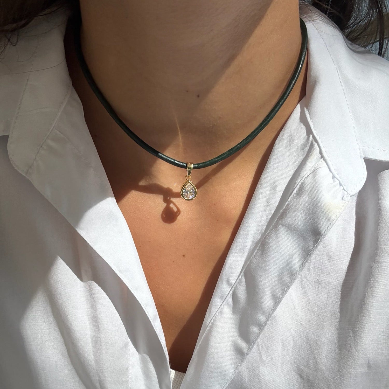 - Deep green 3mm leather necklace with 14k gold filled bezel pear pendant