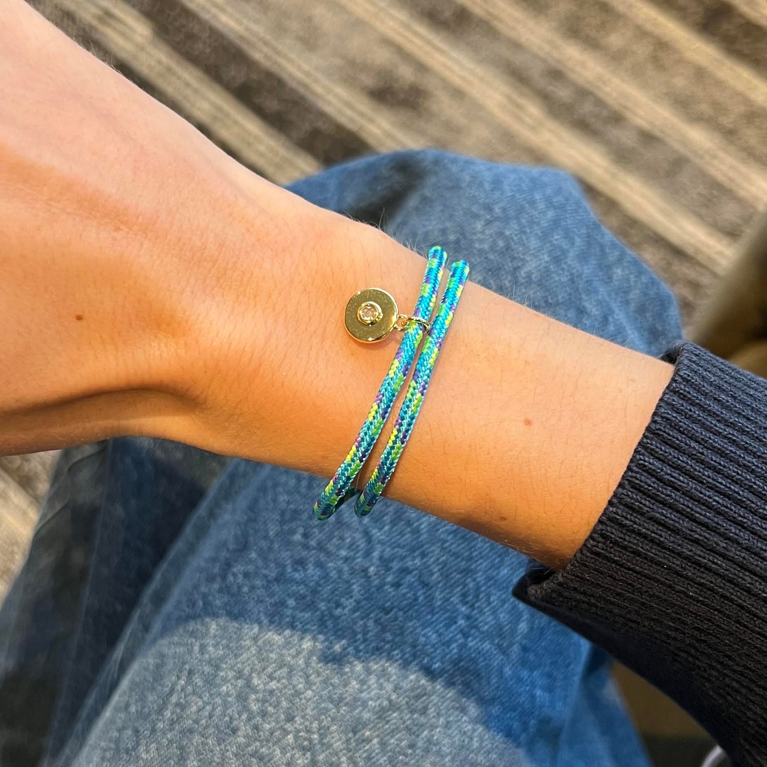 - Adjustable blue paracord bracelet with round gold charm with crystal center