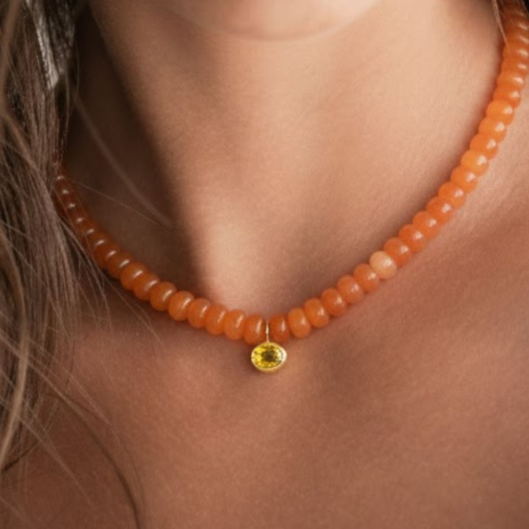 - 14k vermeil yellow gold bezel set lab citrine gemstone oval pendant on orange opal beaded necklace