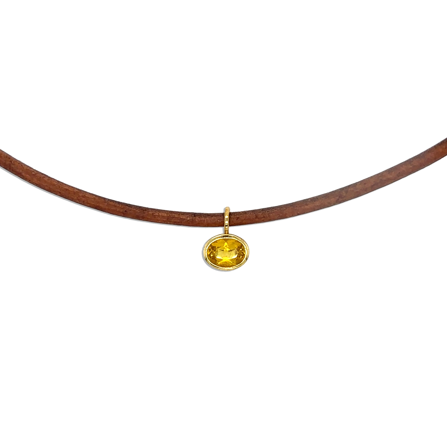 - 14k vermeil yellow gold bezel set lab citrine gemstone oval pendant on brown rubber necklace