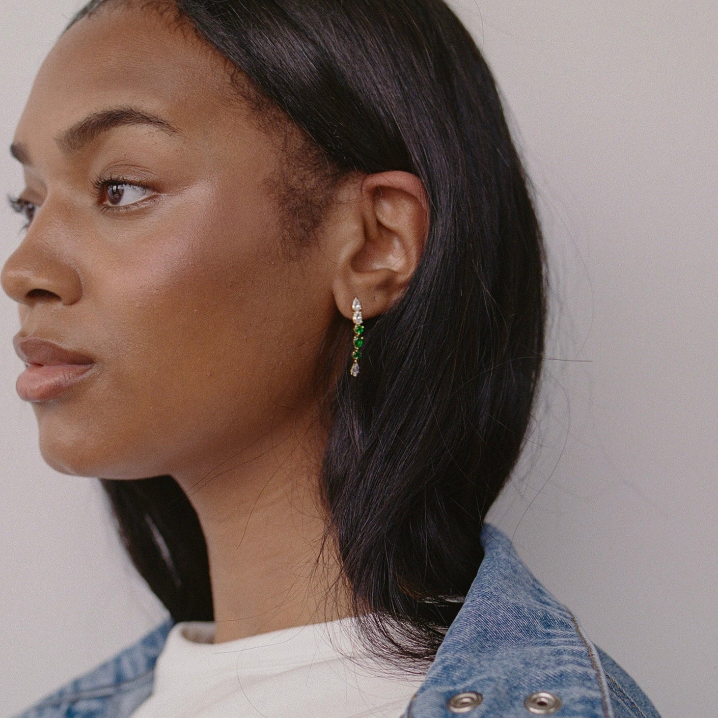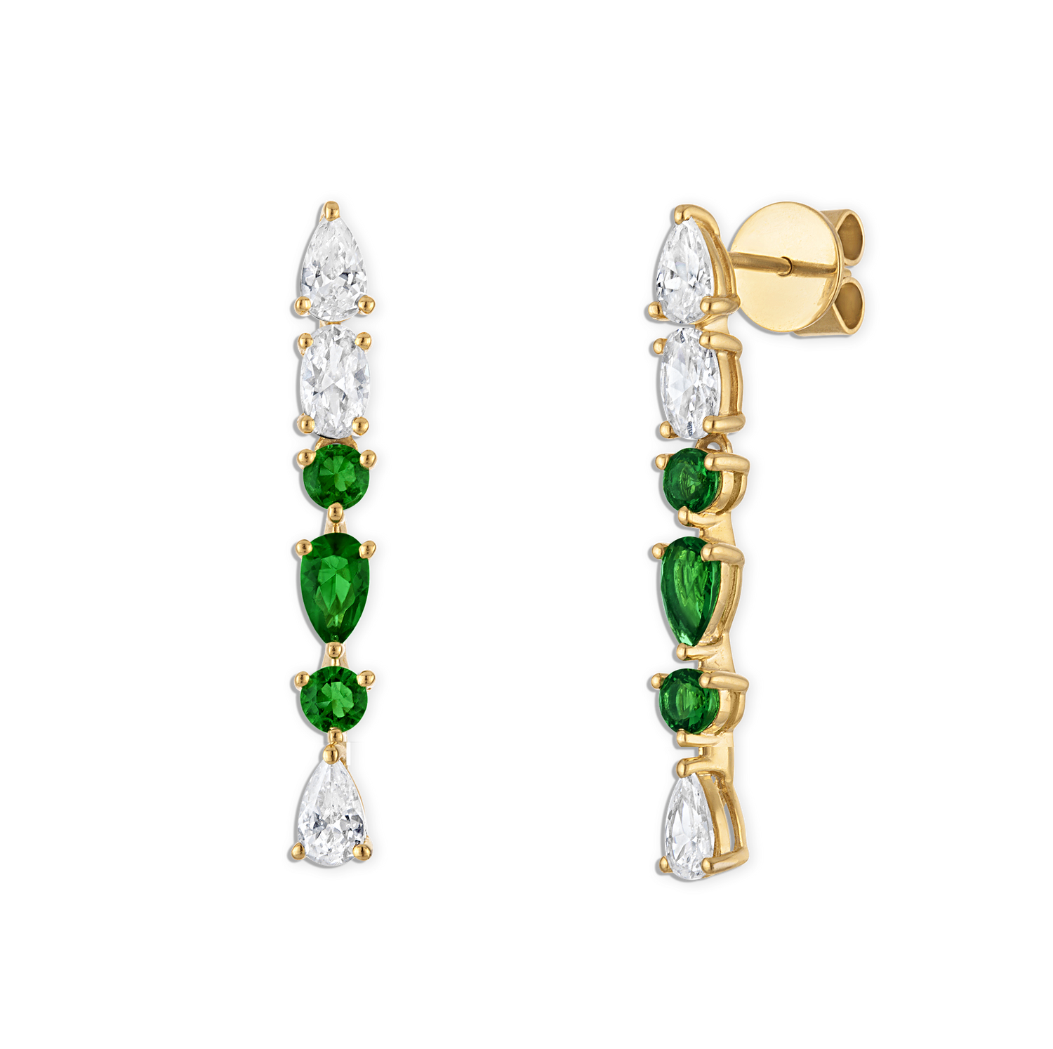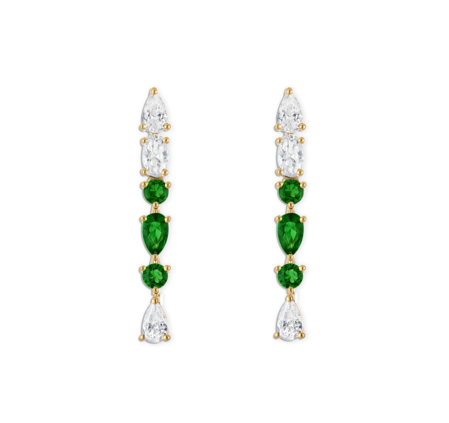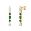 - Yellow gold lab white and green gemstone pear and circle chain bar stud