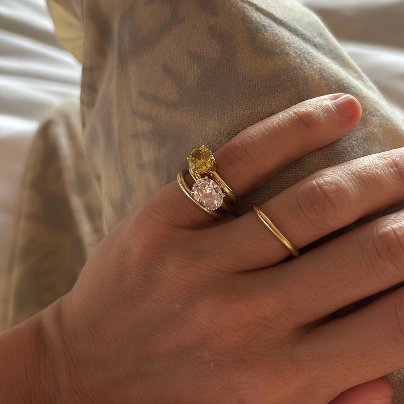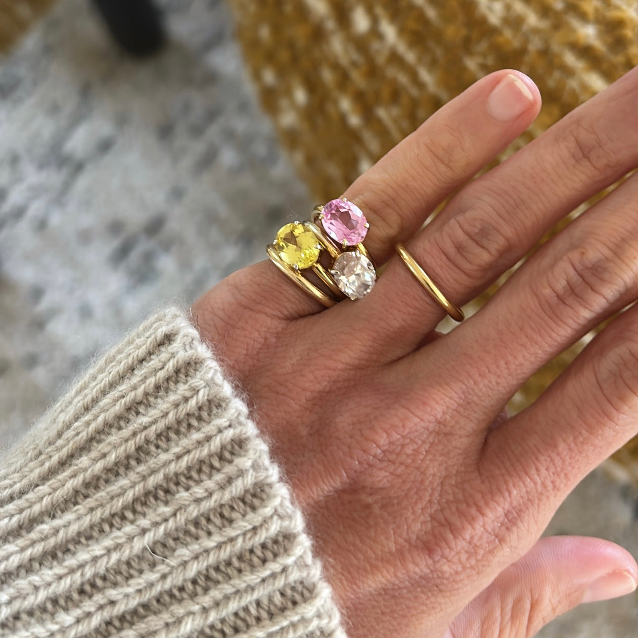 - Vermeil yellow gold pinky ring with prong set lab gemstone E/W oval, 9x7mm