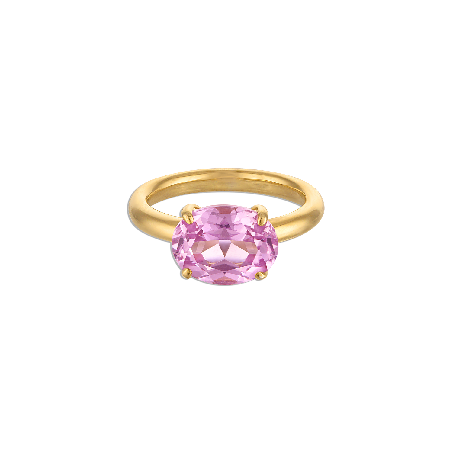 - 14k vermeil yellow gold pinky ring with prong set lab pink gemstone E/W oval, 9x7mm
