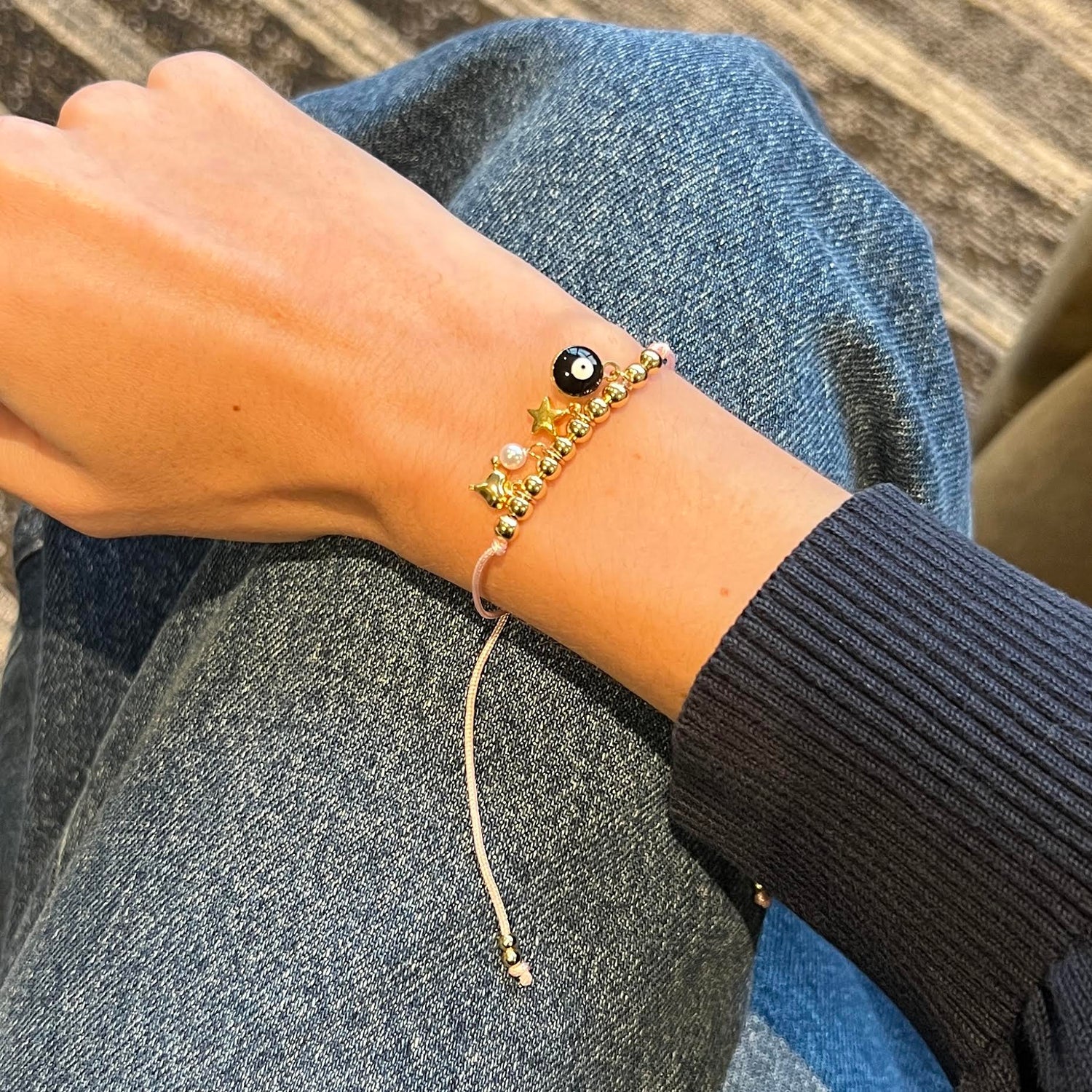 - Adjustable pink string bracelet with assorted gold-plated lucky charms